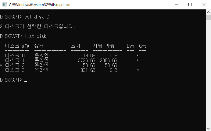 2.4. 'sel disk 2' 입력 및 엔터 (여기서 파티션 삭제 안되는 디스크는 2번임) 후 'list disk' 입력 및 엔터 (2번 디스크 선택 확인. 선택되면 디스크 번호 왼편에 별표 표시 나타남)