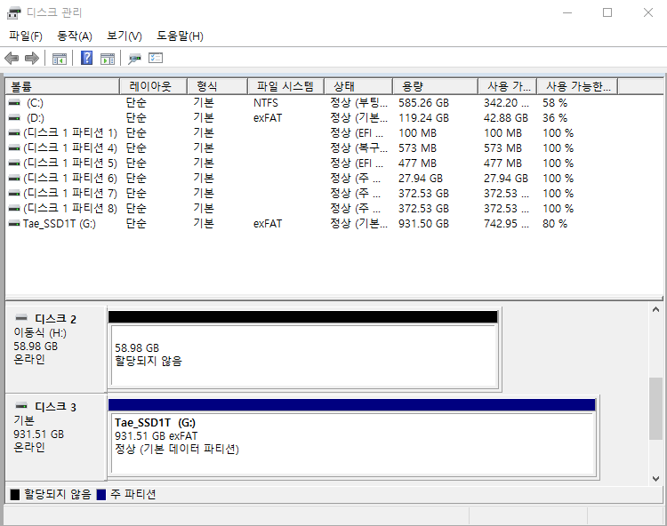 3. Windows 디스크 관리에서 파티션 초기화 확인 (여기서 디스크 2번 초기화 함)